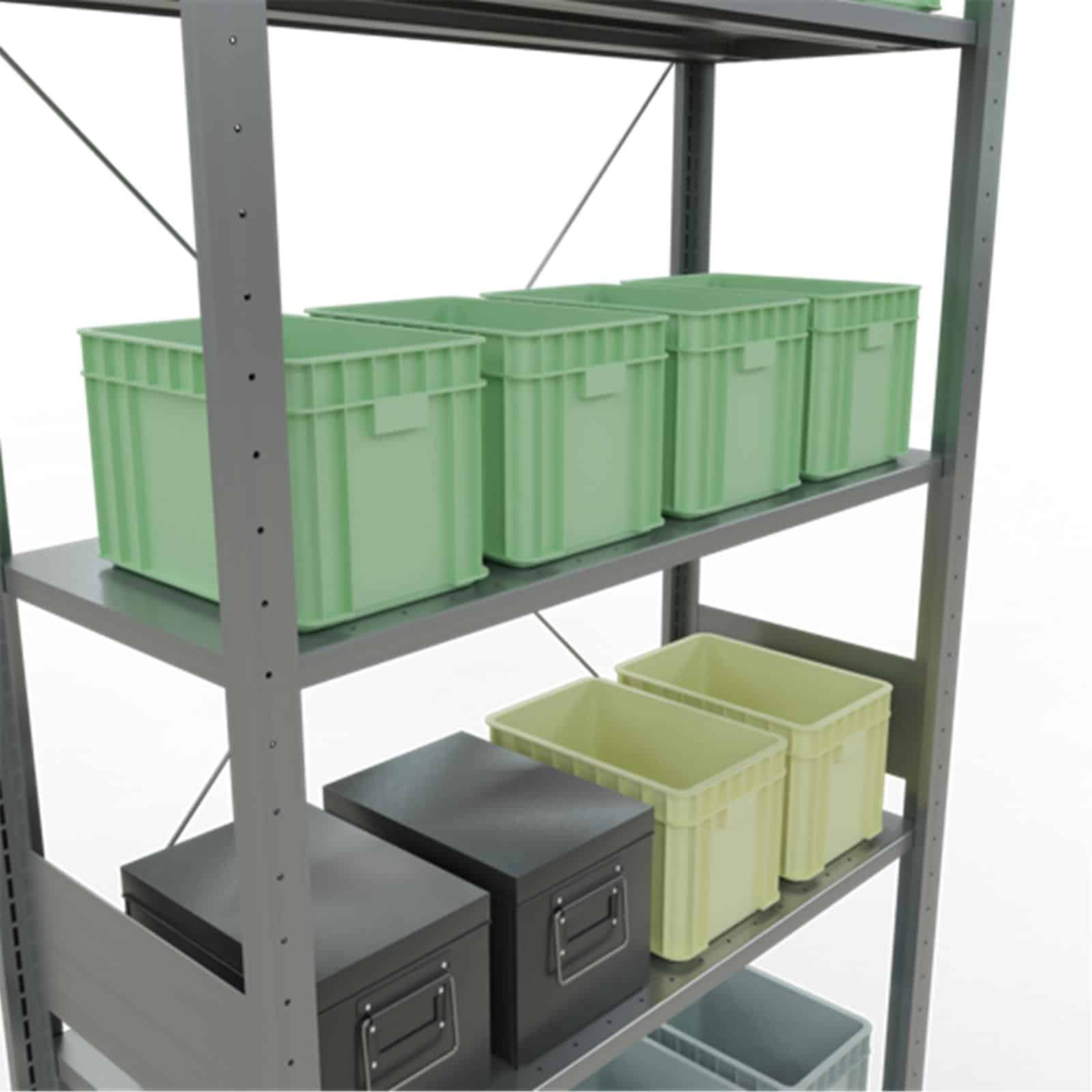 Bei Komplettregalen werden T-Profile und Tiefenriegel standardmäßig in der Ausführung MULTIplus steckbar geliefert. Alle Komplettregale beinhalten Kreuzstreben, Abdeckkappen und Klemmfüße. Wünschen Sie vormontierte Rahmen, werden diese bis 2.500 mm Höhe und 600 mm Tiefe gegen Mehrpreis werkseitig genietet.