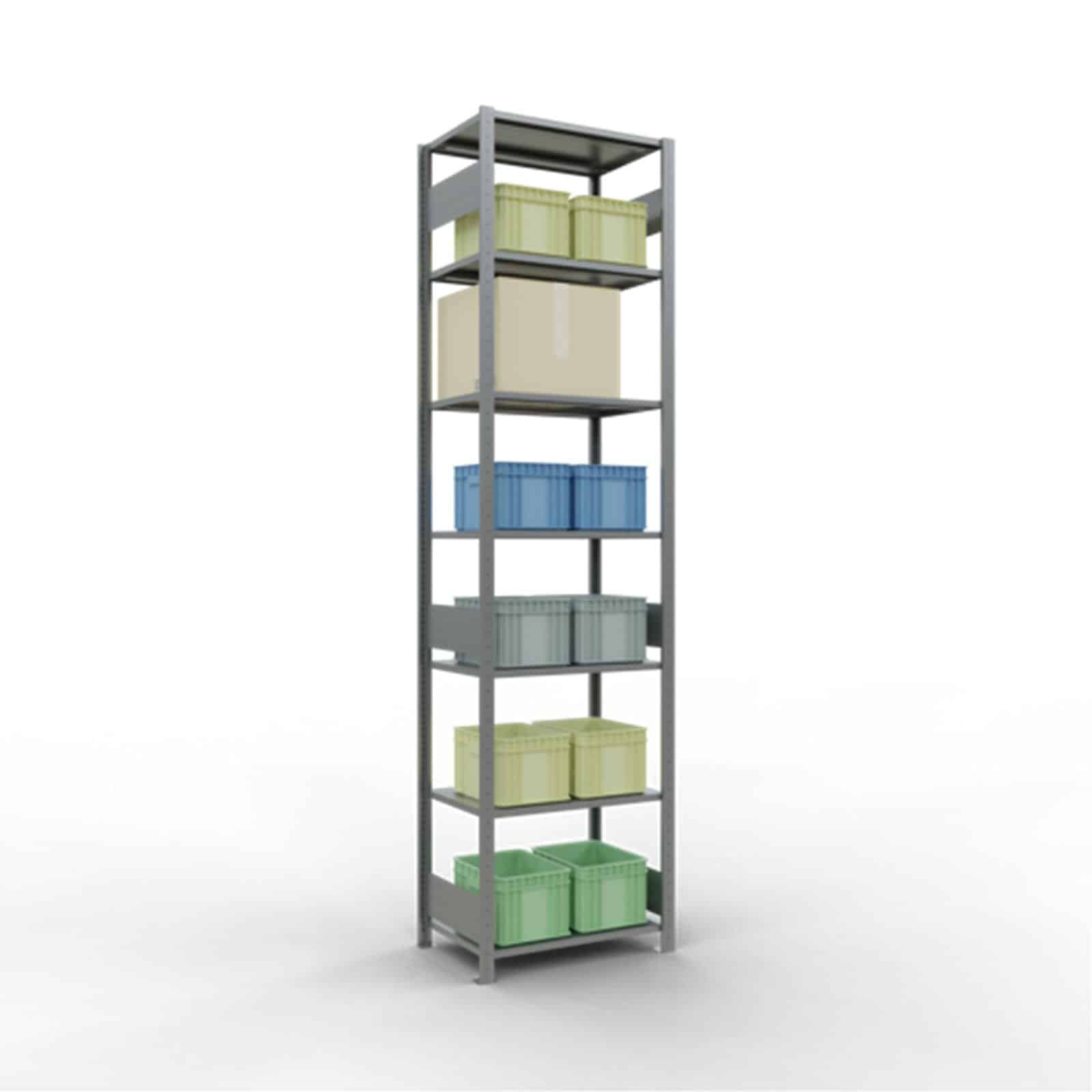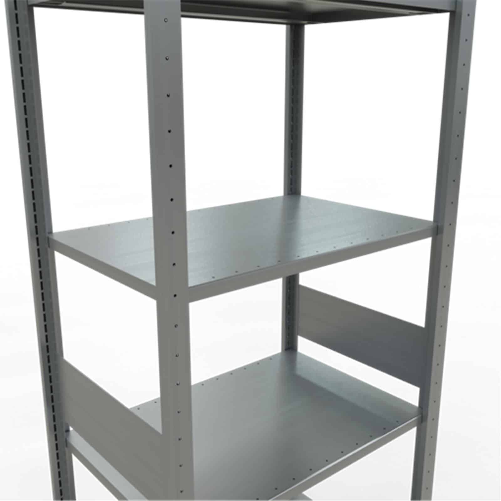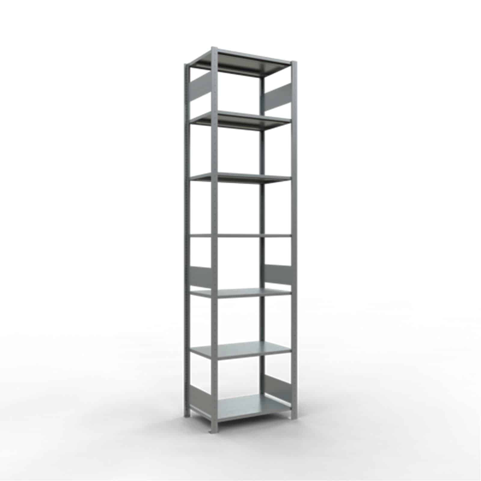 Bei Komplettregalen werden T-Profile und Tiefenriegel standardmäßig in der Ausführung MULTIplus steckbar geliefert. Alle Komplettregale beinhalten Kreuzstreben, Abdeckkappen und Klemmfüße. Wünschen Sie vormontierte Rahmen, werden diese bis 2.500 mm Höhe und 600 mm Tiefe gegen Mehrpreis werkseitig genietet.